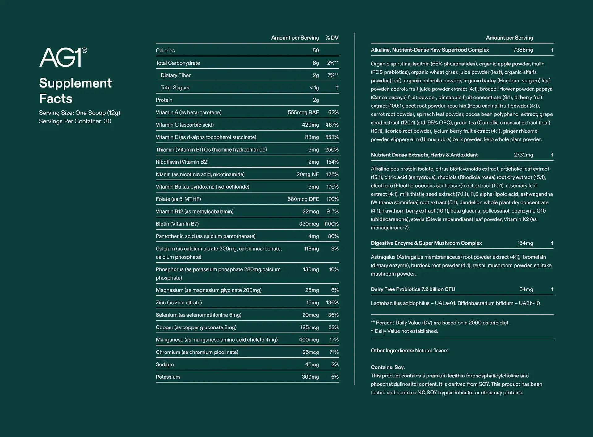 Food is the first place we should look to for nutrition, but the perfect diet is elusive and it's becoming increasingly hard to get everything our bodies need just from what we eat. Daily exposure to a variety of nutrients is also crucial—not only for overall health but for a well-functioning gut. Piecing this together is complex, and we make it simple. AG1 is so much more than Greens. It’s a research-backed daily health supplement that combines a multivitamin, probiotic, B complex, and superfood blend into a single scoop. AG1 makes your health routine easier by delivering what your body needs most, with superior ingredient sourcing for absorption, potency, and nutrient density. Think of it like solidifying your nutritional foundation for optimal health. One scoop per day supports: - Energy production - Digestive regularity & less bloating - Healthy aging and longevity - Immune defenses - Stress recovery Directions: One scoop. In 8-10oz water. Shake. Drink. We recommend drinking on an empty stomach for best absorption. Refrigerate after opening.