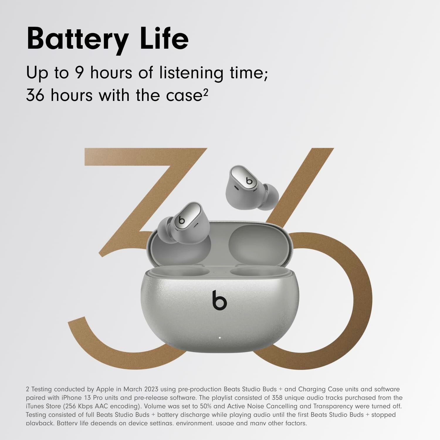 Beats Studio Buds + | True Wireless Noise Cancelling Earbuds, Enhanced Apple & Android Compatibility, Built-in Microphone, Sweat Resistant Bluetooth Headphones, Spatial Audio - Cosmic Silver