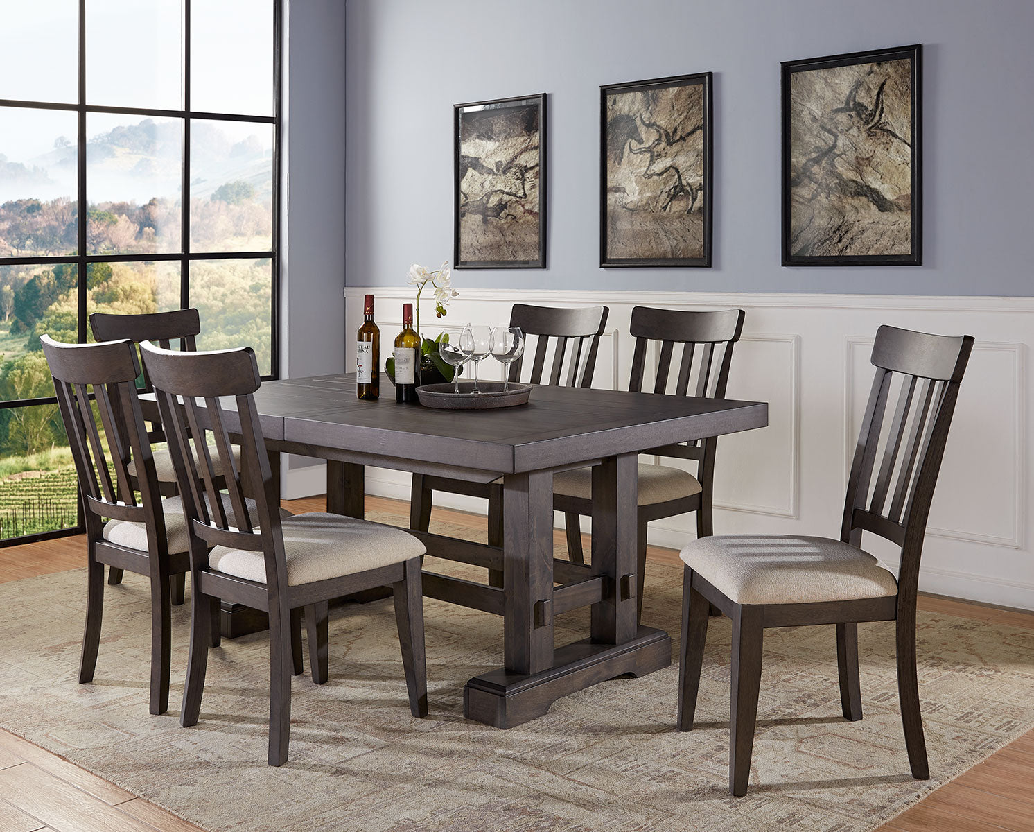 - The Fairview 9-Piece Dining Set provides a grandly scaled dining collection with modern farmhouse styling. Made of mango hardwood solids and mango veneer, this beautiful dining table features a neutral dusty charcoal finish that works in cottage or contemporary settings. The dining table has a plank-effect top and comes with two 18-inch leaves that expand the table to a full 108 inches for seating up to 10 people. The double pedestal base is thick and sturdy and has exposed tenons incorporated in the design. Stretchers on the table base add to the stability and strength of the table. The table leaves are easily removed or added with the help of metal cable system which one person can easily operate. The table leaves can be stored in the built in table leaf storage area underneath the table top. The table pairs gracefully with the slat back chairs that are ample in size and comfort.9-Piece Set Includes: Dining table and 8 side chairsFairview Dining Table:Constructed of mango hardwood and mango veneers
