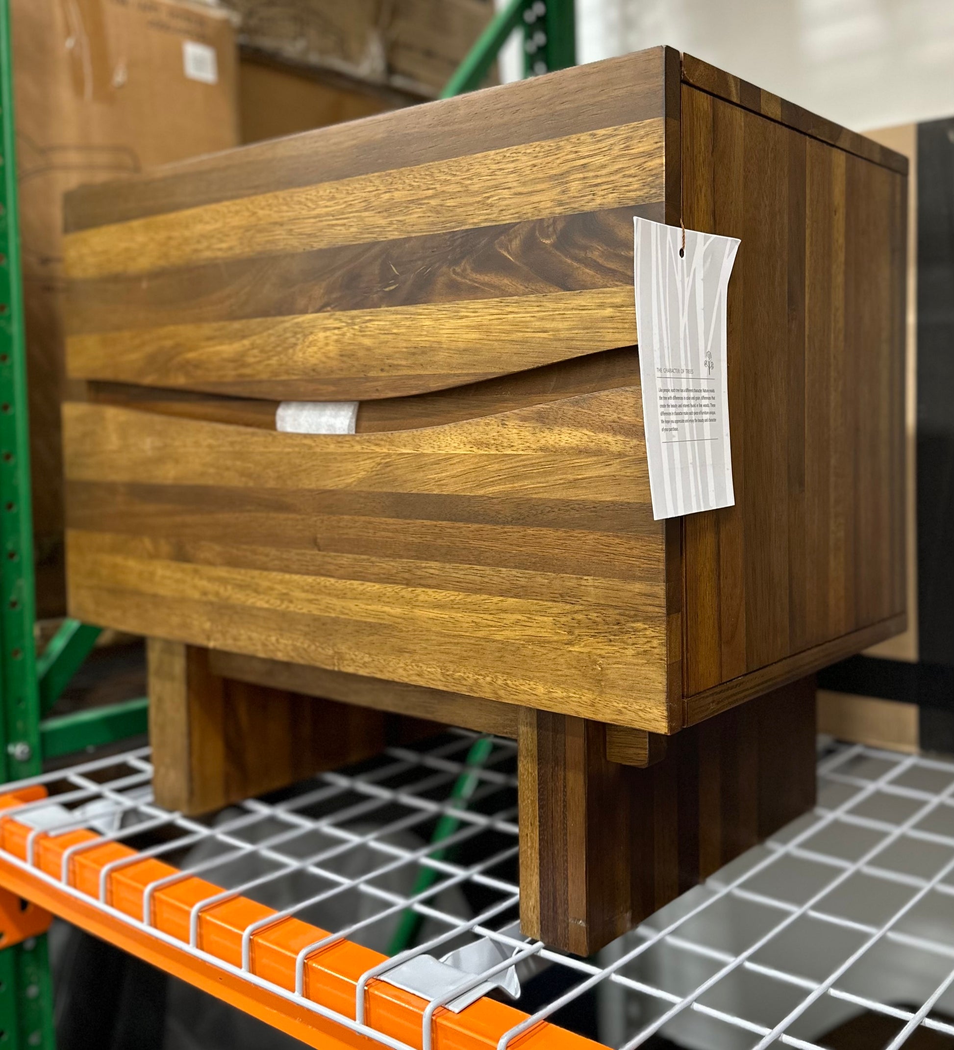 Inspired by modern California beach-chic, the beautiful Rivina nightstand is crafted from a solid Sengon Tekik frame and Sengon Tekik veneers in a vibrant natural finish. Distinctive wave fronts provide the perfect canvas for hidden drawer pulls, all sitting atop an airy base to complete this sea-inspired design.