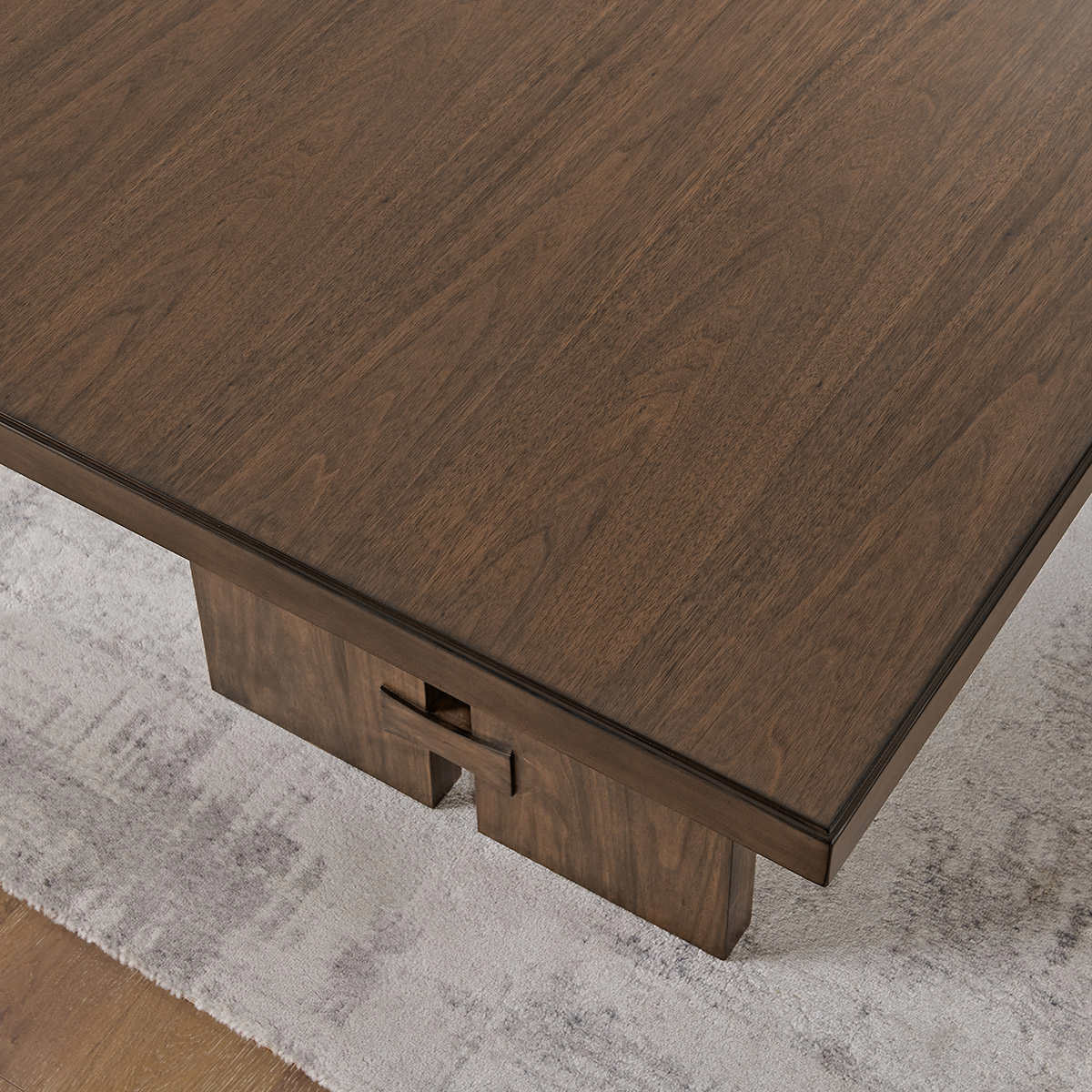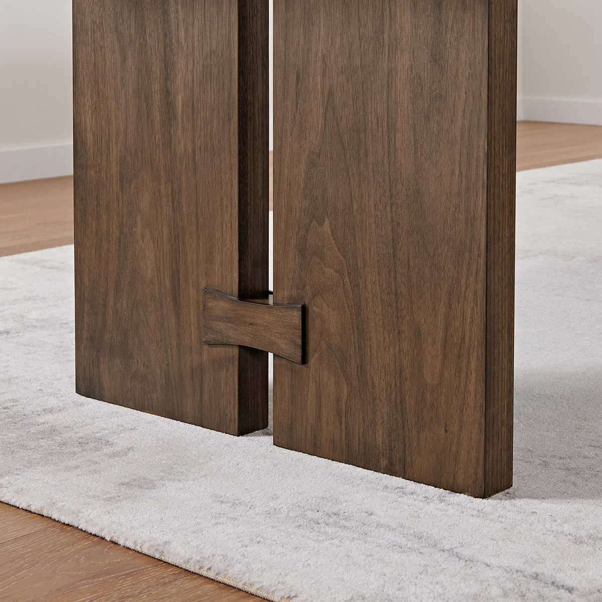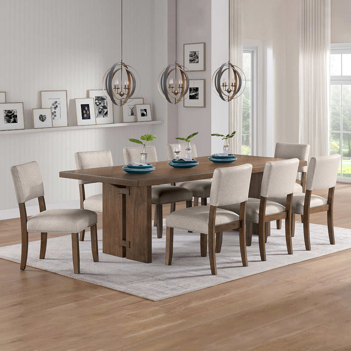 The Thomasville LaSalle Dining Set goes to great lengths to delight diners. This handsome set boasts a long, sturdy table constructed of poplar solids and walnut veneers. The slab style double pedestal base is artfully joined with bowtie accents that are certain to be a conversation starter. Eight chairs are each fabric upholstered and equally sturdy with rubberwood solids.